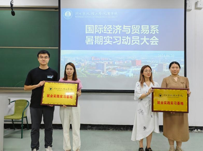 2024年6月20日晚,商学院国际经济与贸易系于SC113开展2024年暑期实习动员暨新增就业实习基地签约大会,面向国贸普通班、专升本、中美班等各个年级近250名学生,现场座无虚席,并特别邀请了宁波思逸倍欣进出口有限公司、万尚(宁波)时装有限公司、宁波科友信息科技有限公司、宁波创盈控股集团有限公司四家优质企业来校宣介,商学院副院长李雪艳、国际经济与贸易系主任何巨、副主任何羽丰、危薇及顾明老师参与了本次活动。