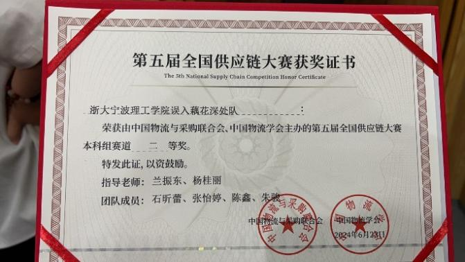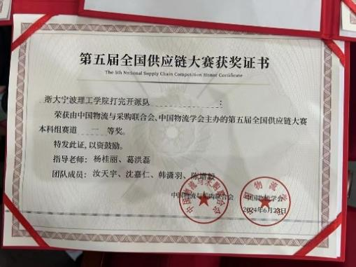 2024年6月20-23日,第五届全国供应链大赛决赛在浙江杭州举行。本届大赛由中国物流与采购联合会与中国物流学会主办,厦门易木科技有限公司提供技术支持,决赛由浙江经济职业技术学院承办。大赛设有企业组、教师组、本科组和专科组。经过激烈角逐,由兰振东老师、杨桂丽老师和葛洪磊老师带队的两个参赛队伍分别获得了一等奖和二等奖,刷新历史记录。获得一等奖的参赛学生还可获得由中国物流与联合采购会颁发的供应链管理师职业能力中级证书。