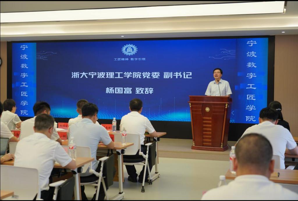 杨国富在成立仪式上致辞。他强调,浙大宁波理工学院作为地方高水平应用型大学,有责任也有能力为宁波乃至全国的数字产业人才培养贡献力量;通过‘宁波市数字工匠学院’,能够汇聚各方资源,培养出更多符合时代需求的数字工匠,为宁波数字产业和数字经济高质量发展提供强有力的支撑。