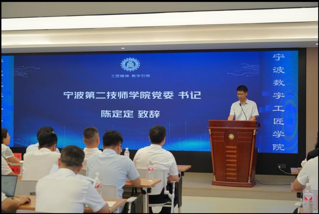 7月2日,在宁波市总工会支持下,学校商学院与宁波市数字信息产业工会、海曙区总工会、宁波第二技师学院联合共建的“宁波市数字工匠学院”成立仪式暨首批学员培训班开班仪式在商学院举行。宁波市总工会党组成员、副主席宋雁,学校党委副书记杨国富、教务处处长沈昊宇、地方合作处副处长马佳星、商学院党委书记马翔,宁波第二技师学院党委书记陈定定、副院长付娴等市总工会、合作院校和企业领同出席成立仪式。