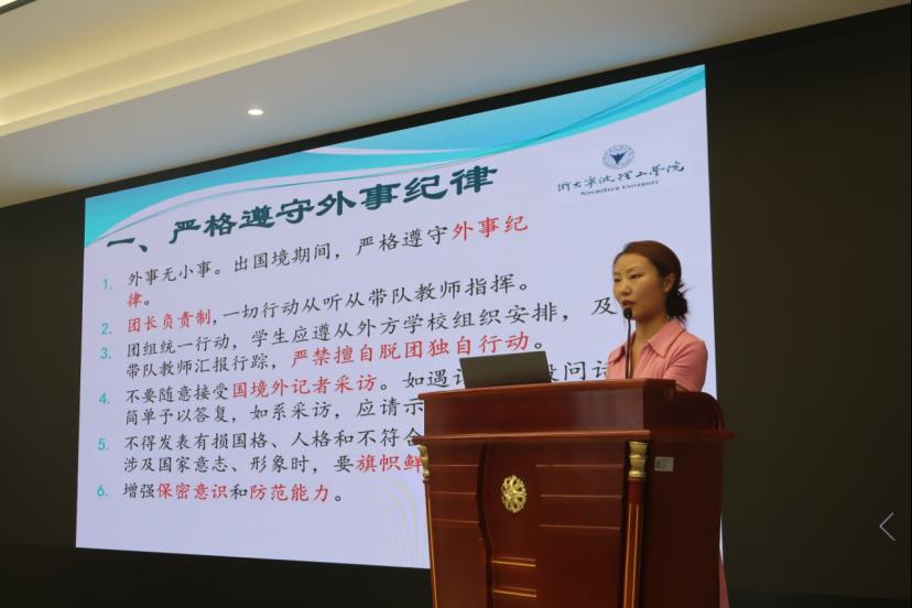 励呈仪老师和许金校老师从赴美前航班信息报备、新生适应周、学费缴付、宿舍选择、体检与疫苗本准备等重要环节,赴美必备生活用品与入境文件材料,美国最新入境政策,人身安全、财务证件安全等注意事项,向同学们进行了详细解读。吴佼老师向同学们解读了关于毕业退寝、毕业生登记表相关事项。
