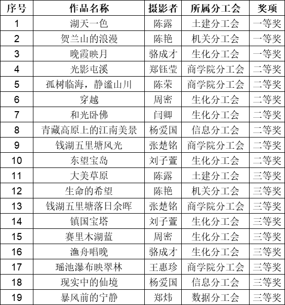 最后,大赛共收到了参赛作品39件。经过评选,共评选出一等奖作品3个,二等奖作品7个,三等奖作品9个。这些优美的摄影作品,不仅留下了美好的时光,也展现了祖国的大美河山。