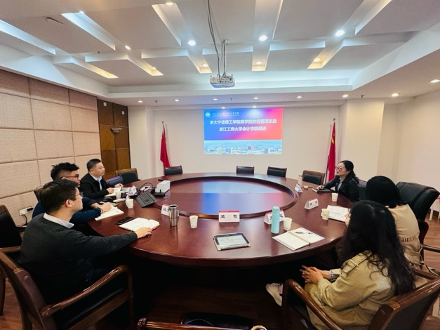 在浙大宁波理工学院硕士点申报战略引领下,依托商学院“专业建设月”品牌活动,财务管理系于2024年10月25日走访了浙江工商大学会计学院。围绕会计硕士点申报的专业建设工作,双方就专业课程建设、学生竞赛实习、深度产教融合等议题展开了深入交流。浙江工商大学会计学院副院长谢诗蕾教授、财务系主任马文超教授、胡玉可副教授,以及浙大宁波理工学院商学院财务管理系主任卢红旭副教授、支部书记王山慧副教授、副主任杨阳老师、魏军老师,财务管理系会计专硕申报执行负责人楚雪老师参加了本次调研交流活动。