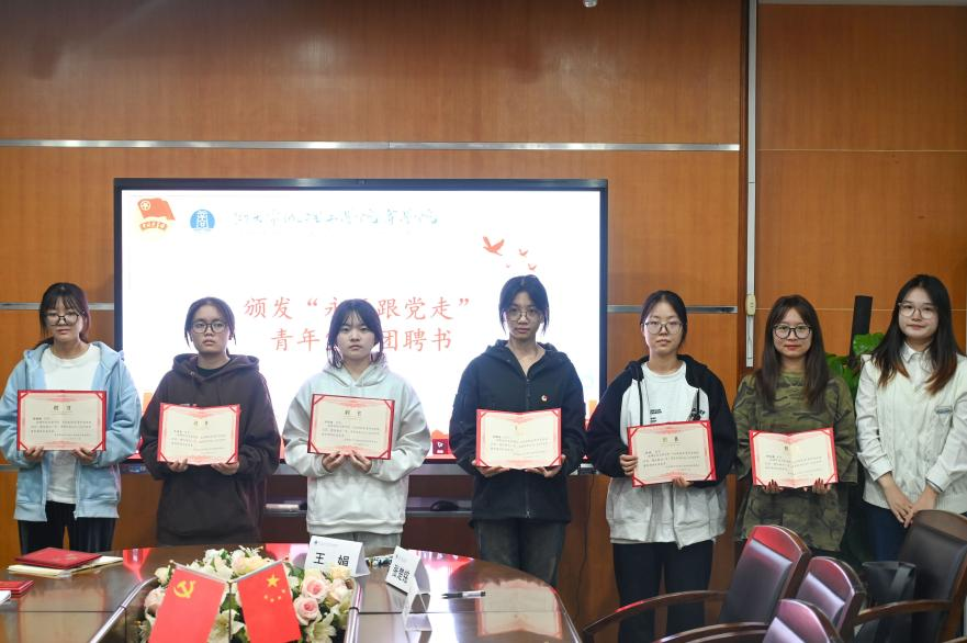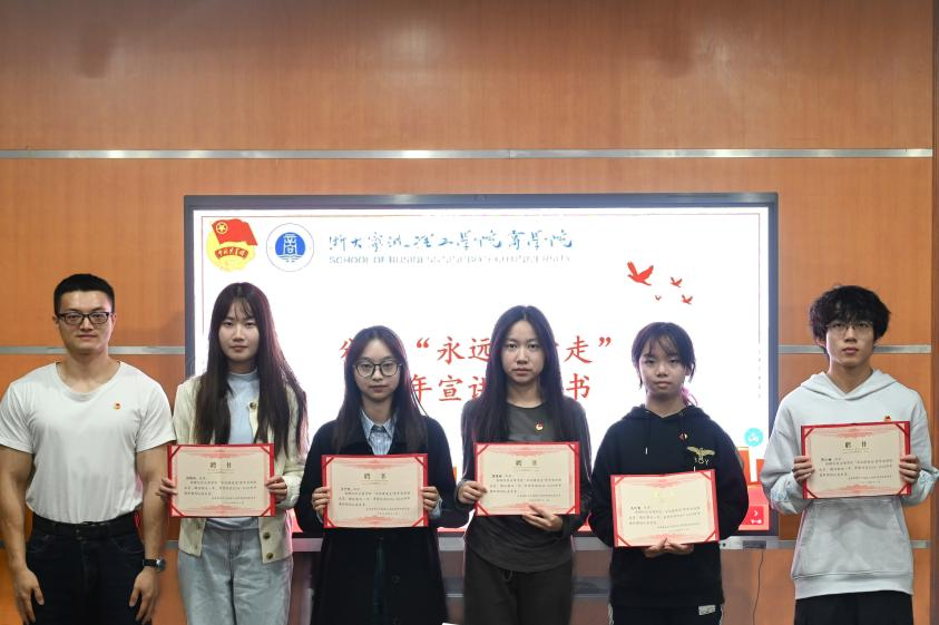 接着,为商学院“永远跟党走”青年宣讲团聘任仪式。商学院团委书记张楚铭、商学院团委副书记(学生)王娟、商学院团委团建工作中心主任何名玉卉以及22级宣讲员代表郑婕同学为2024级团支书颁发聘书。