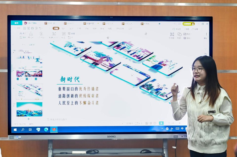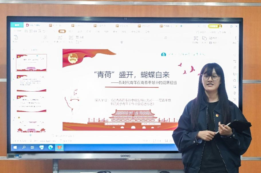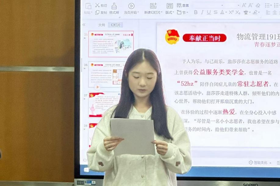 第一位是2022级宣讲员代表郑婕同学。她通过展示自己的思政微课PPT,从自身出发教大家如何进行选题,以及如何让团课变得生动有趣。