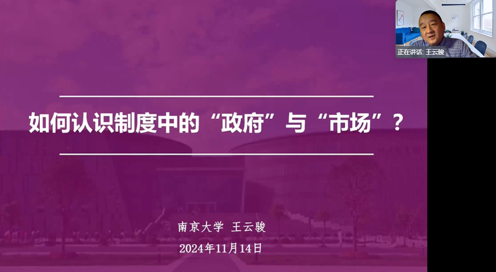 2024年11月14日晚,商学院智库论坛第十五讲在热烈的学术氛围中拉开帷幕。本次讲座由南京大学政府管理学院教授、博士生导师王云骏主讲,主题为“如何认识制度中的‘政府’与‘市场’?”。讲座由商学院苗青教授主持,吸引了40位师生在线参与。