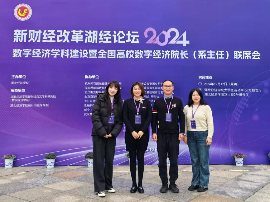 12月12日,商学院学术副院长赵小睿副教授带领数字经济系晁嵩蕾副教授、吴桐博士、姜妍博士参加“新财经改革湖经论坛(2024):数字经济学科建设暨全国高校数字经济院长(系主任)联席会”,来自中国人民大学、南京大学、上海财经大学、对外经济贸易大学、中南财经政法大学等30余位与会嘉宾围绕新财经改革和数字经济人才培养、学科建设、科研创新、产学研合作等核心议题展开深入交流与探讨。