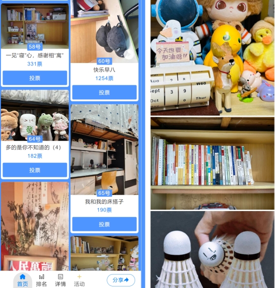 寝室风采展:评选出一等奖2个寝室、二等奖3个、三等奖4个及优秀奖若干。这些获奖寝室以其独特的风格和创意,展现了大学生的积极向上风貌和寝室文化的独特魅力。