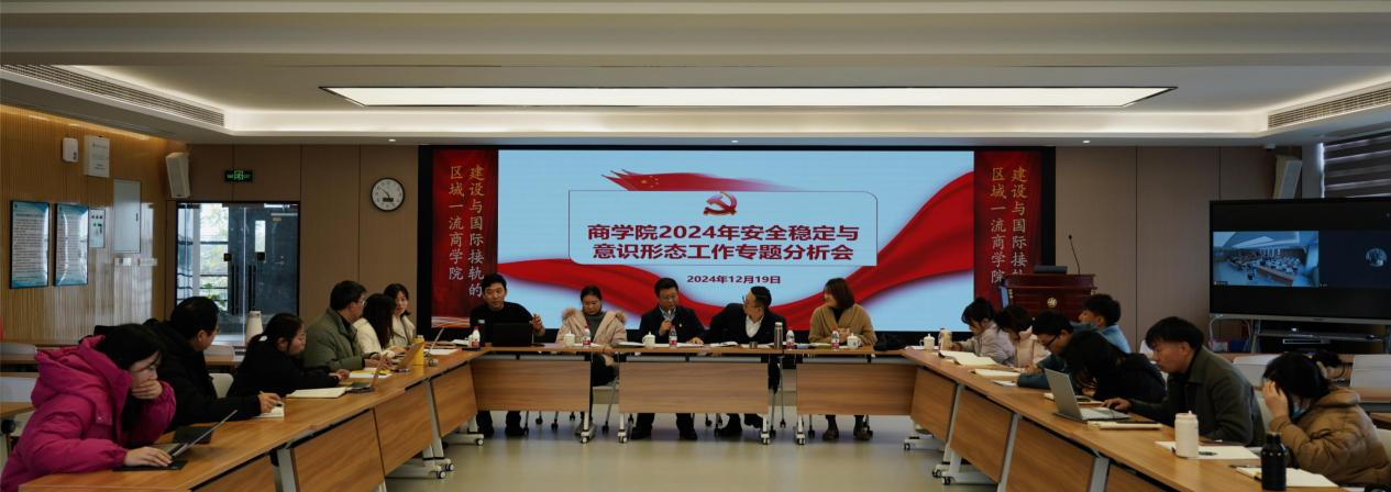 会上学院领导班子就各自分管领域的意识形态工作进行履职情况做了汇报。报告了2024年商学院党委以习近平新时代中国特色社会主义思想为指导,认真落实党中央和上级党组织关于意识形态和安全稳定工作的决策部署及指示精神,履职尽责,坚持安全稳定和意识形态两手抓,切实守牢安全稳定底线,夯实了意识形态主阵地。