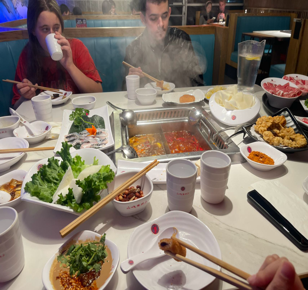 此外,他们还带着住家体验了正宗的中国火锅文化。坐在热气腾腾的火锅桌前,大家兴奋地挑选各类食材,涮煮牛肉、豆腐、蔬菜等,品尝不同的口味搭配。住家成员对火锅的社交属性表现出极大的兴趣,感叹这种“围炉而食”的方式能够让人们在轻松的氛围中增进感情。在交流过程中,同学们向他们介绍了不同火锅底料的风味,例如麻辣锅、清汤锅,以及火锅的历史和中国南北方的饮食差异。这次体验不仅让他们爱上了火锅的美味,也加深了他们对中国饮食文化的理解和认同。