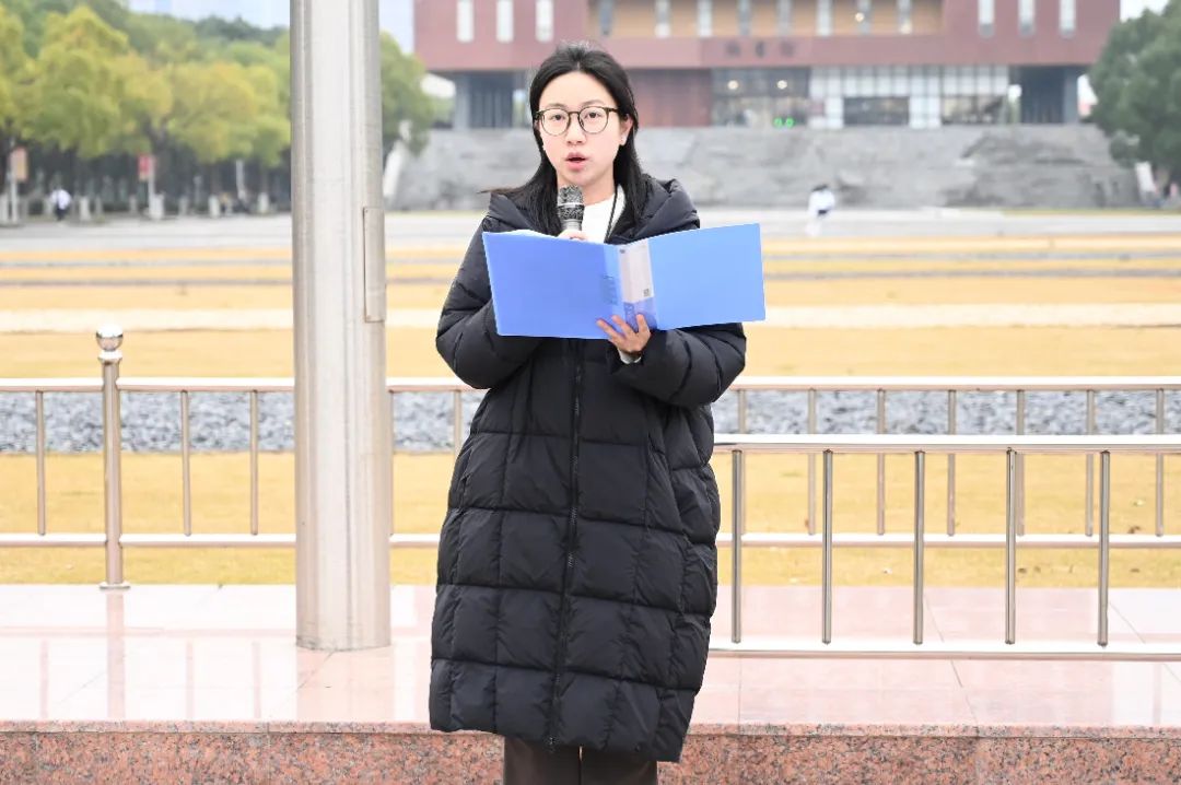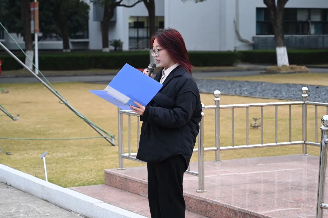 接着,物流241班周栗妍作为新生代表进行发言。她表示,新时代青年站在巨人的肩膀上,享受着先辈们用生命换来的和平与繁荣,更应该铭记历史,传承爱国精神。新时代呼唤新青年,新青年要有新作为,要敢于创新,勇于突破,在各自的领域中追求卓越。