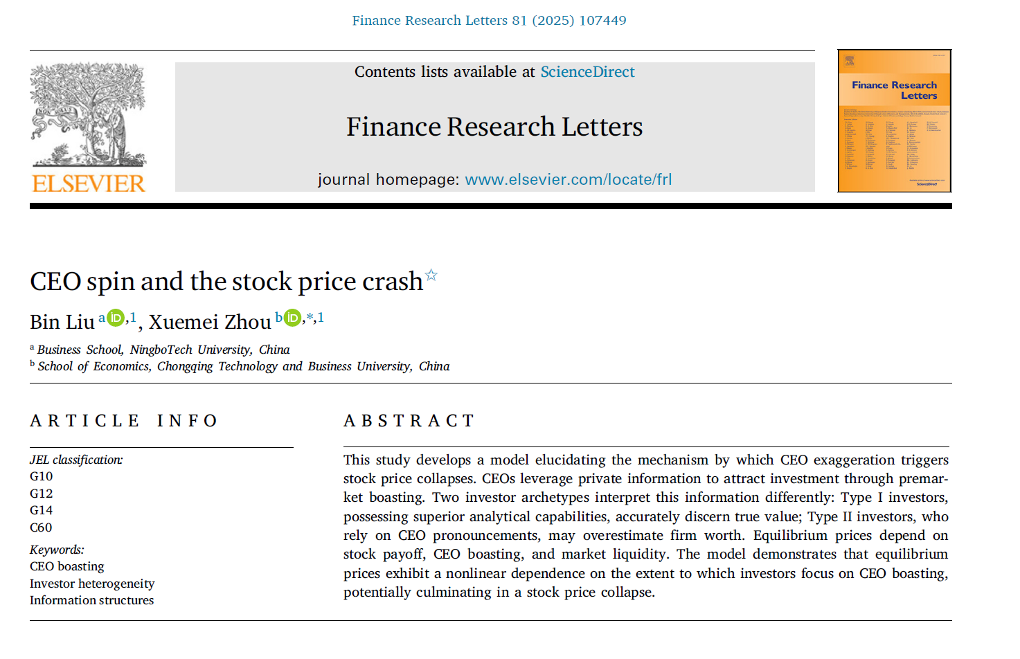 近日,商学院刘彬博士作为第一作者发表的研究论文《CEO spin and stock price crash》在金融市场和金融经济学领域重要期刊《Finance Research Letters》第81卷(2025年)正式发表。该期刊是国际权威学术期刊之一(学科BUSINESS, FINANCE: 7/231),该研究通过构建内生性模型,首次揭示了CEO信息传递行为在不同信息透明度环境下对股价崩盘风险的异质性影响机制,为监管机构识别市场风险提供了创新性理论框架。根据JCR最新统计,该期刊影响因子为7.4,属于SSCI一区、中科院经济类TOP期刊。该论文由刘彬博士和另外一位合作者共同完成。
