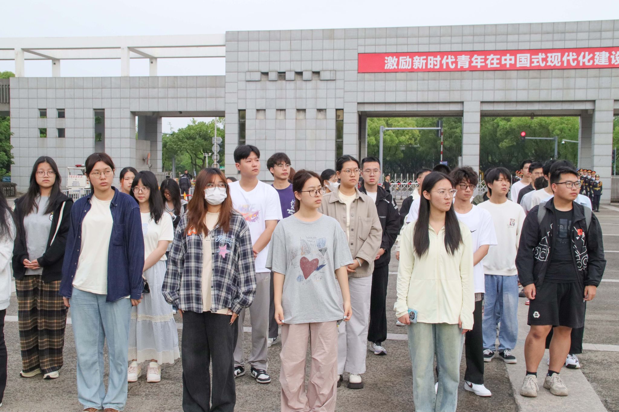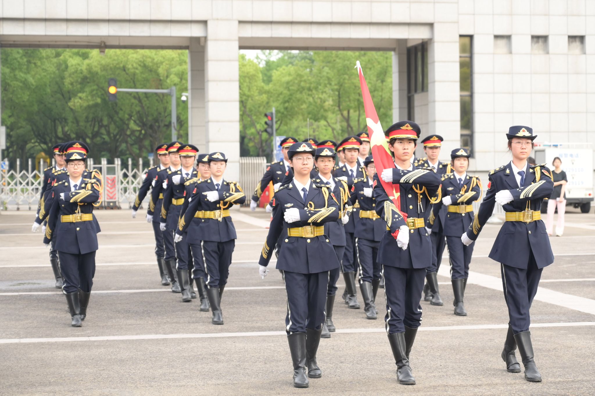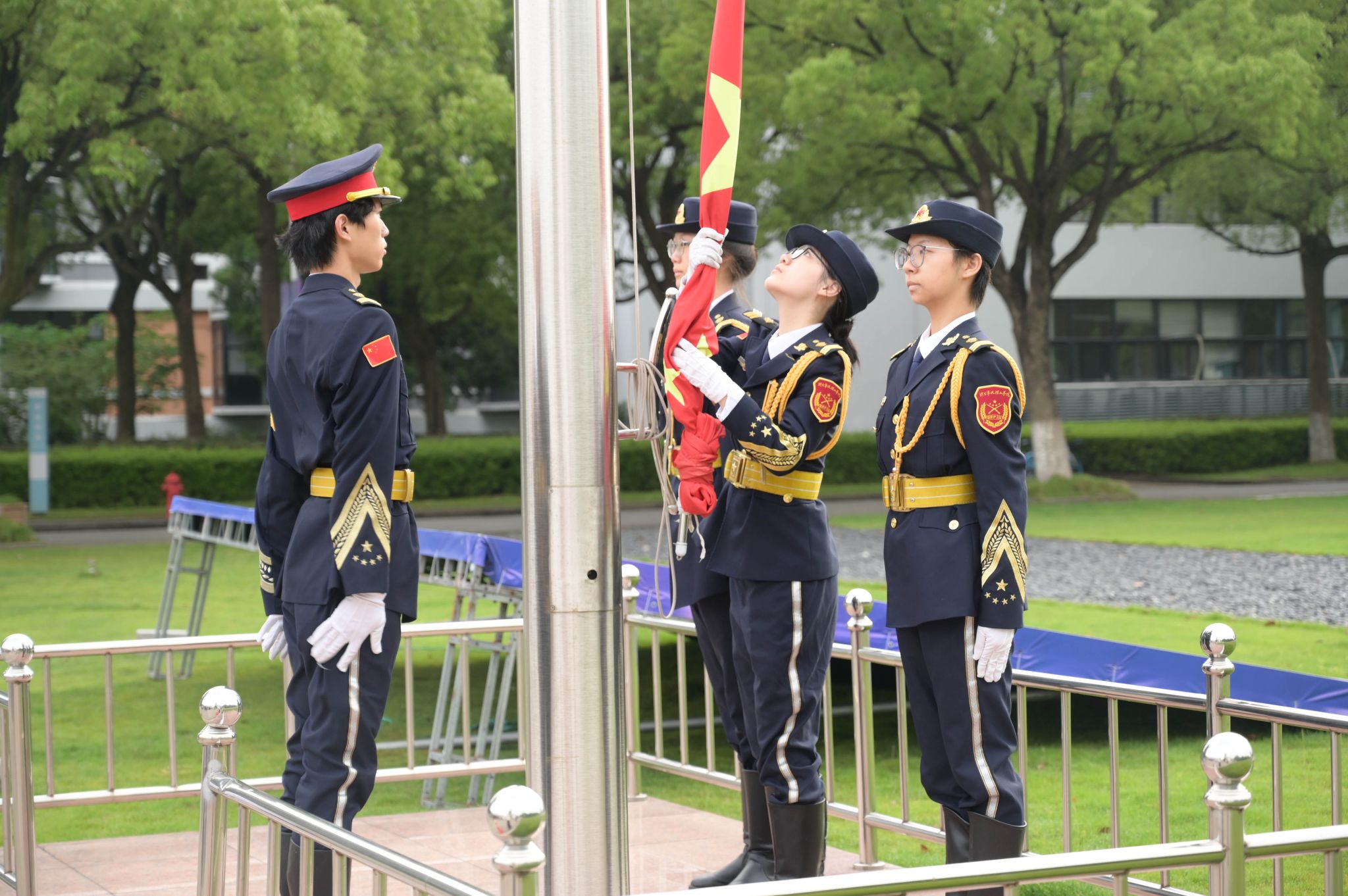 清晨6点40分,升旗仪式正式开始。国旗仪仗队的队员们身着笔挺制服,迈着整齐划一的步伐进行国旗交接仪式。国歌前奏响起,全体师生神情肃穆,注目五星红旗在和煦的微风中舒展飘扬,缓缓升起,国歌的旋律在校园上空久久回荡。