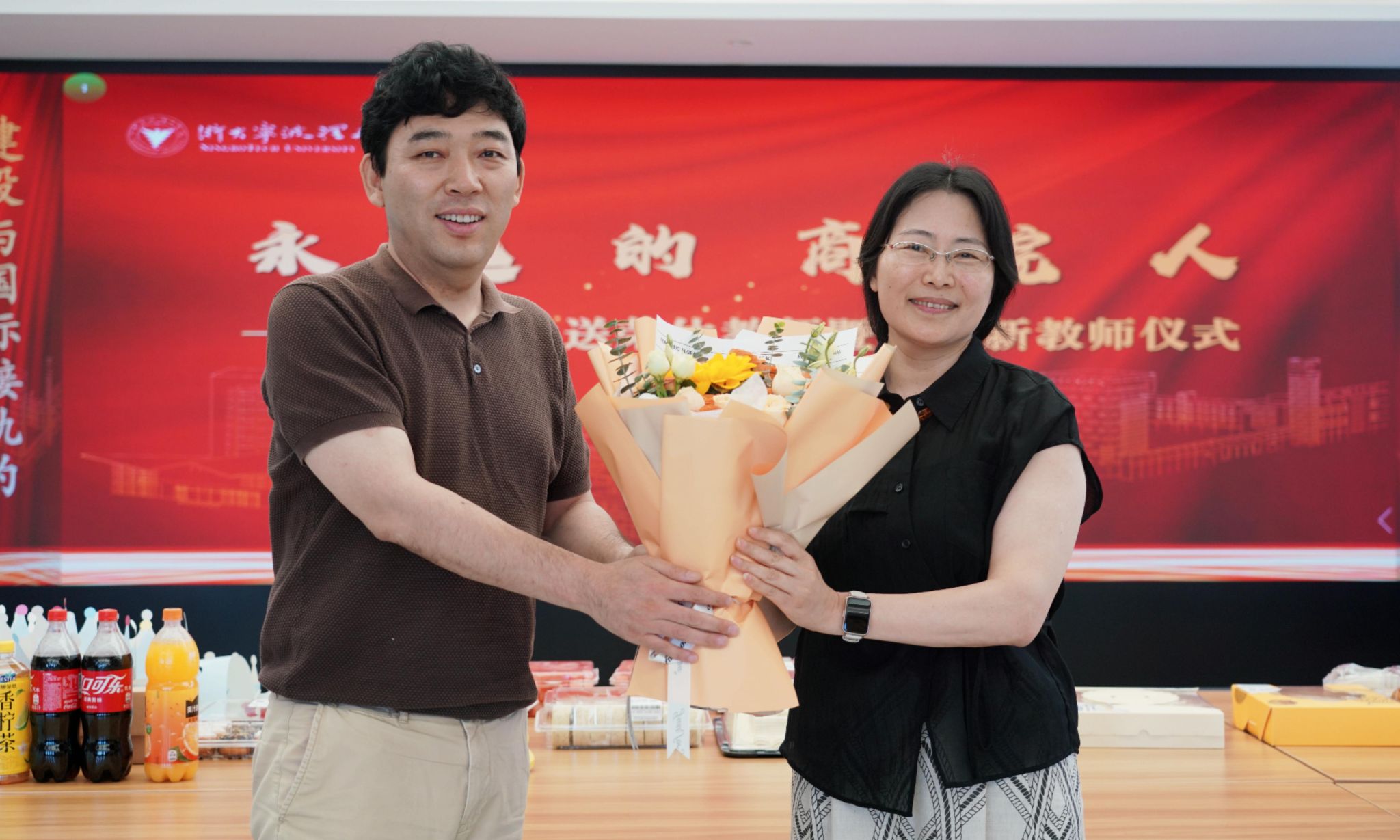活动进入新教工欢迎环节。截至6月份新入职的10位教师依次登台,通过趣味自我介绍和“现场问答”迅速融入商学院大集体。学院向新教师赠送了专属定制款水杯,希望新教师们接过荣休教师王惠珍递交的装满经验的“水杯”,再慢慢用对待教学和科研的热情续满在三尺讲台上的“空杯”,完成教育使命的接力,携手为教书育人谱写新篇章。