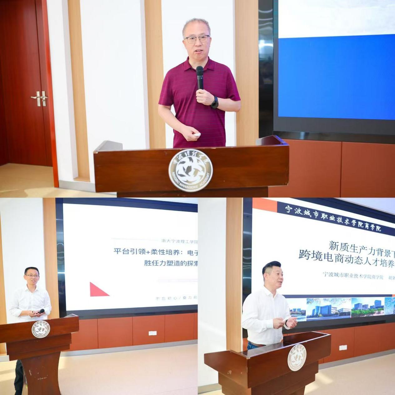 学术报告环节,浙江大学马述忠老师、浙大宁波理工学院董新平老师、宁波城市职业技术学院胡坚达老师分别带来题为“数字贸易课程建设与学科发展”“平台引领+柔性培养:电子商务人才动态胜任力塑造的探索与实践”“新质生产力背景下跨境电子商务动态人才培养模式研究”的精彩分享。