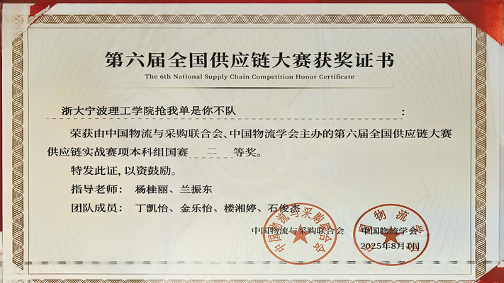 全国供应链大赛自2020年启动已成功举办了五届,2023年大赛被列入“全国普通高校大学生竞赛观察排行榜”,赛事影响力逐年提升,行业关注度不断提高。越来越多的企业将大赛视为提升员工技能、强化内部培训的重要平台与契机。第六届全国供应链大赛供应链实战赛项设置本科组、职教组、职工组。本次大赛吸引了来自全国30个省、自治区、直辖市的近900所院校及企业,共计6600余人参赛。大赛历经供应链管理师基础理论考核、省赛、全国初赛,最终本科组60支队伍入围全国总决赛。由杨桂丽老师和兰振东老师指导的“抢我单是你不队”队经过激烈角逐,以第24名的成绩挺进全国总决赛,并获得了二等奖的好成绩。