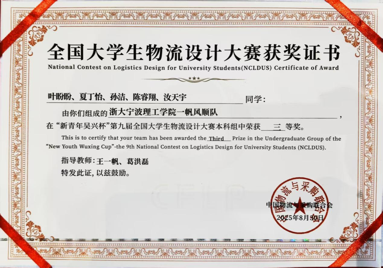 近日,“新青年吴兴杯”第九届全国大学生物流设计大赛圆满落幕。浙大宁波理工学院代表队表现优异,斩获全国赛三等奖,充分展现了我校在物流创新与实践领域的卓越实力和人才培养成效。