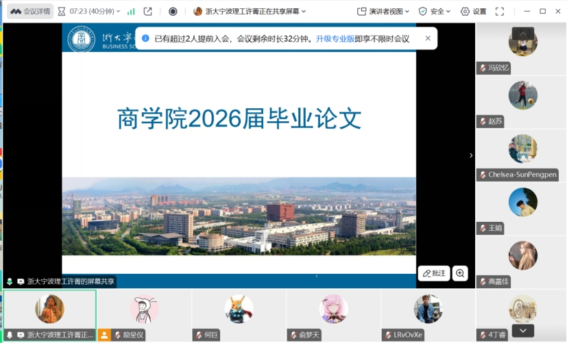 2025年10月23日上午,商学院召开2022级中美班赴美学生第二次线上交流会。商学院党委副书记、纪委书记赵苏,副院长李雪艳,班导师何巨,辅导员张楚铭、吴极限及中美班教务老师励呈仪参加。本次会议特别邀请到了商学院教务办许菁老师给同学解读关于毕业论文的注意事项,帮助大家做好毕业论文相关准备。