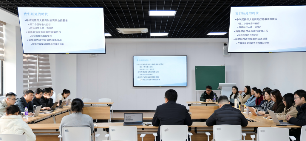 苗青院长以“我们所处的时代”开篇,分析了党的二十届四中全会重点阐述的科技自立自强水平大幅提高这一伟大目标指导下,未来高等教育新要求及应用型院校发展的定位、机遇与挑战。他勉励青年教师找准定位,牢记初心,努力成长为“有定力的六边形战士”,实现教学、科研与社会服务的均衡发展。戒骄戒躁,锚定关键绩效目标,懂得取舍之道。