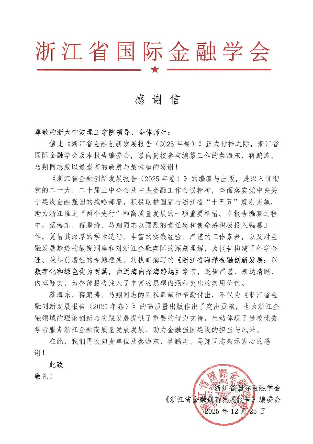 近日,浙大宁波理工学院收到来自浙江省国际金融学会及《浙江省金融创新发展报告》编委会发来的感谢信。信中对蔡海东、蒋鹏涛、马翔三位老师在《浙江省金融创新发展报告(2025年卷)》编纂工作中的杰出贡献致以诚挚感谢。
