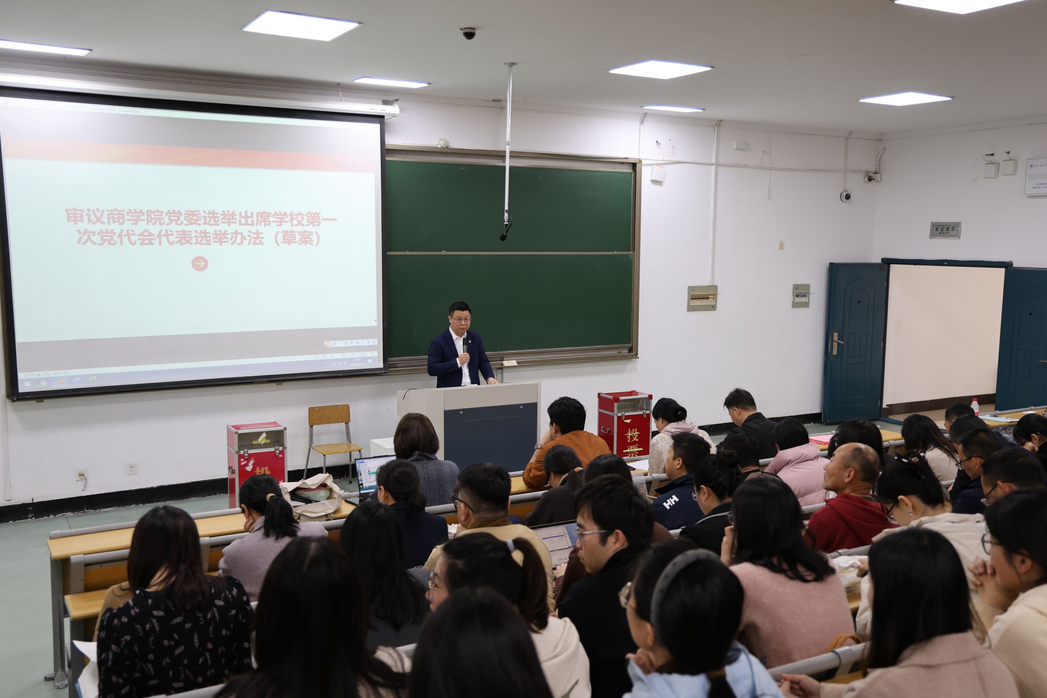 大会审议通过了《商学院党委选举出席学校第一次党代会代表选举办法(草案)》,总监票人、监票人、总计票人、计票人名单,以及出席学校第一次党代会代表候选人预备人选名单。