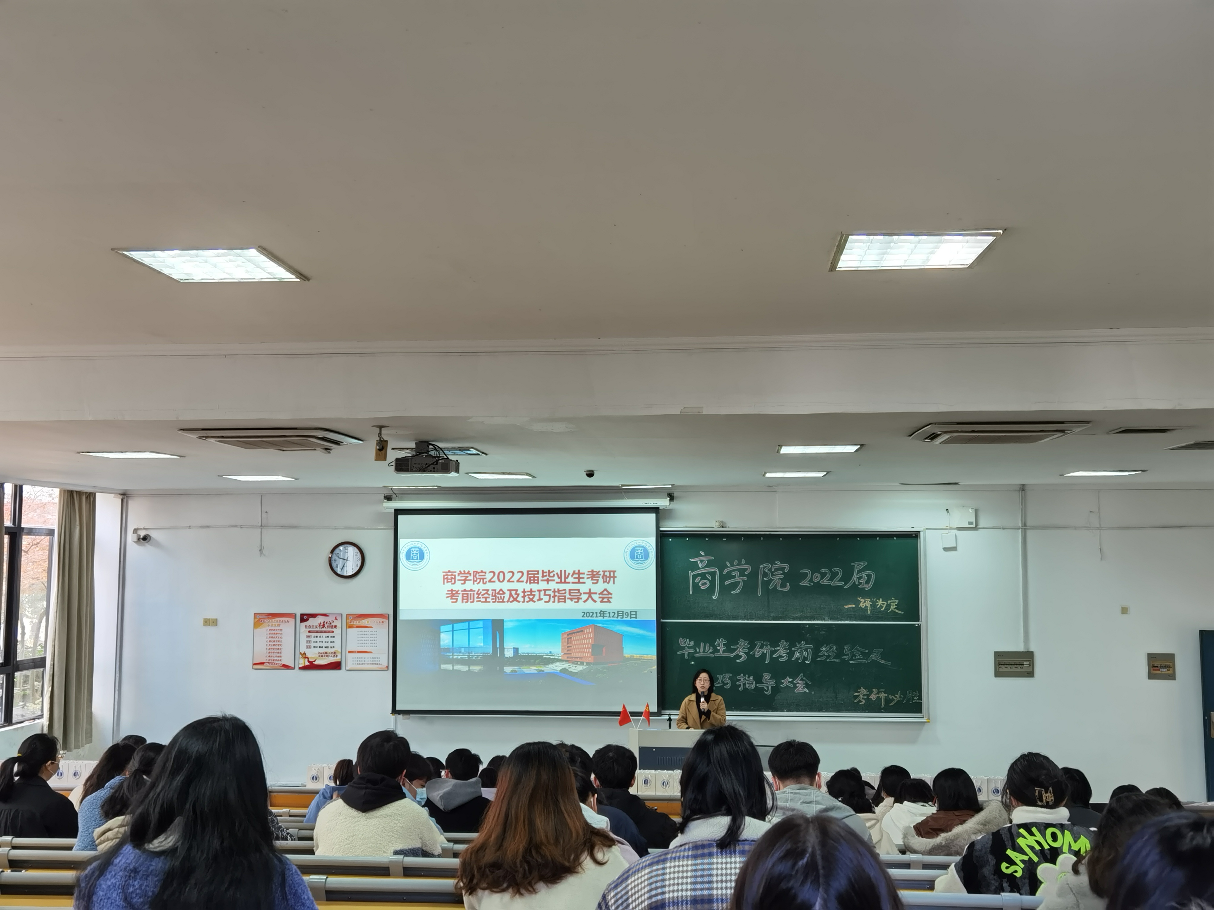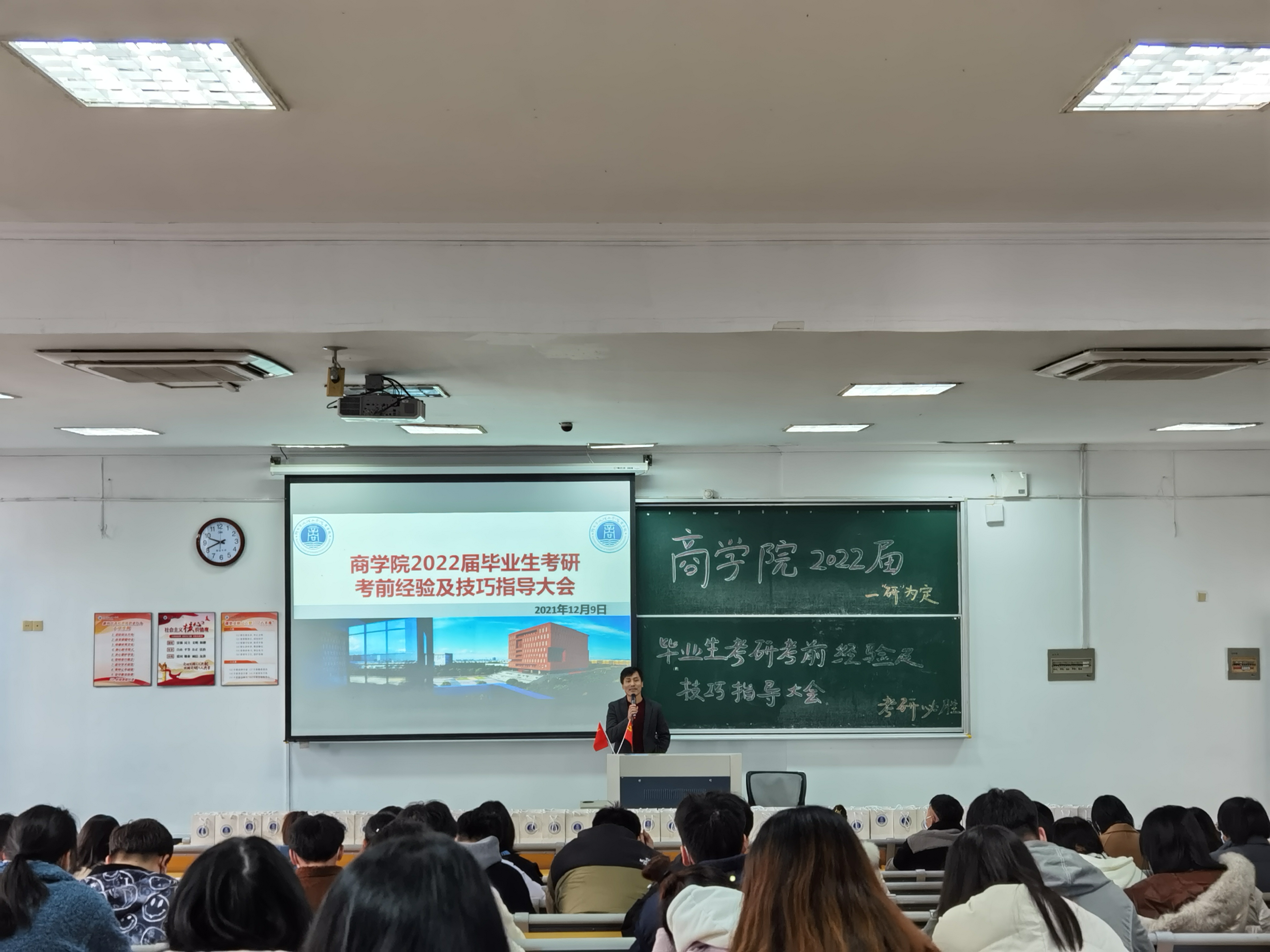 为做好2022届考研学生的考前指导,让他们坚定考研必胜信心,商学院于12月9日上午,在SC317教室组织召开考研考前动员大会。学院副院长鞠芳辉、学院党委副书记兼纪委书记吴琼、学院党政办主任苏衍宝、学工办辅导员及学院2022届部分考研学子参加本次大会,会议由就业辅导员赵昌志老师主持。