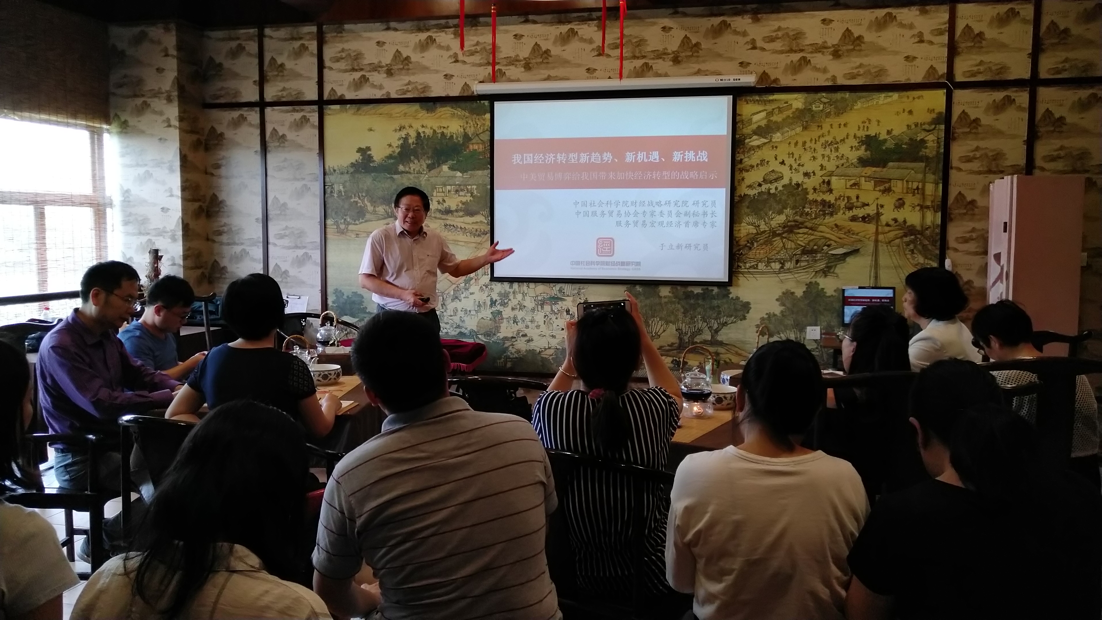 2018年6月13日中午,学院在大益爱心茶室举办了第二十二期学术沙龙,此次沙龙学院邀请了中国服务贸易协会专家委员会副秘书长、中国社会科学院财经战略研究院研究员、中国世界贸易组织研究会理事于立新,为我们带来了《我国经济转型新趋势、新机遇、新挑战—中美贸易博弈给我国带来加快经济转型的战略启示》的主题分享。
