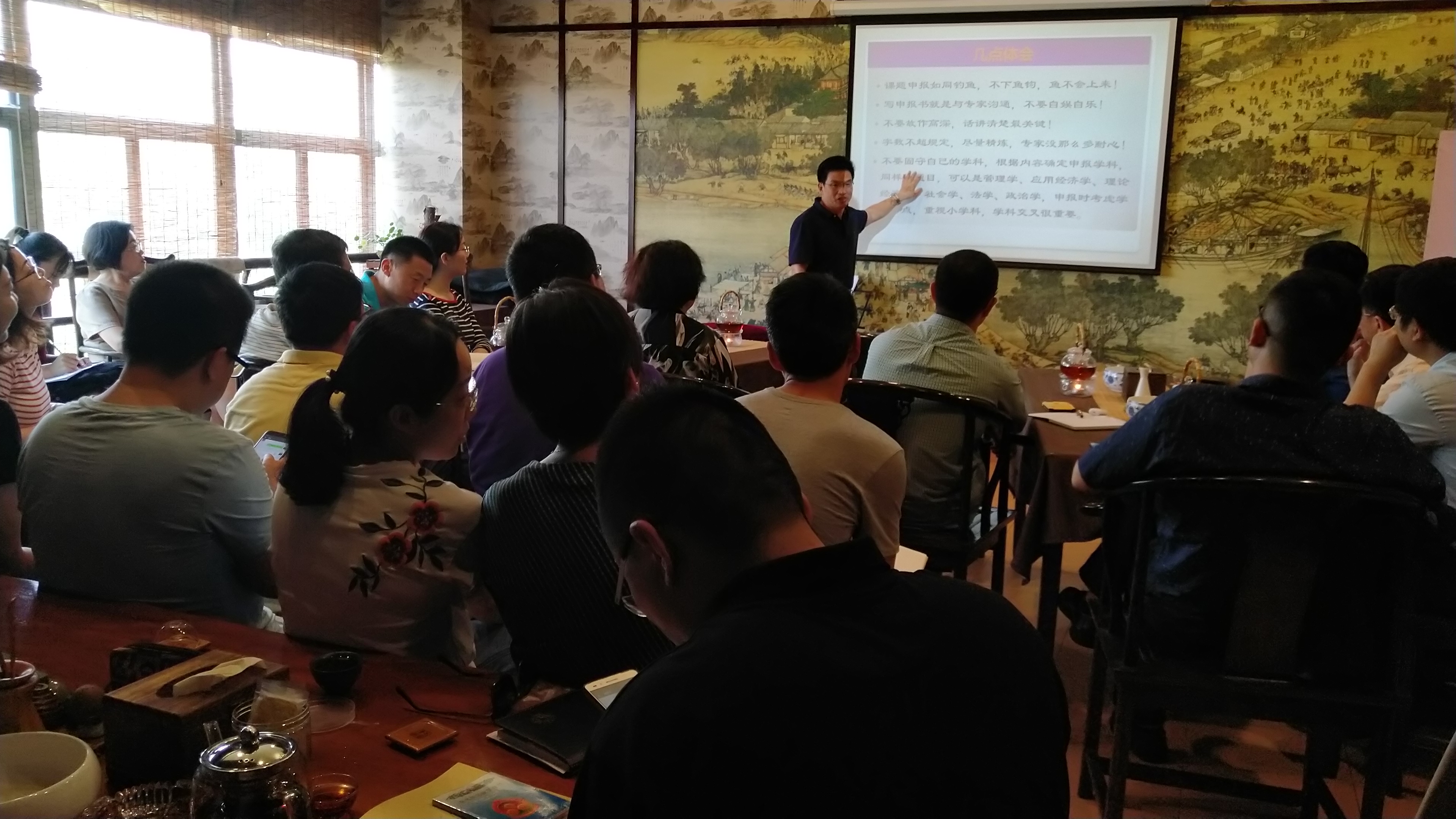董进才教授结合自己及团队多年在社科基金申报过程中的经验和体会,从选题角度到内容撰写讲解了社科基金申报中的各种要点难点。同时,董教授还特意一一点评了我院今年申报的七本社科基金申报书,详细讲解了每本申报书的不足之处,并提出改进意见。会后,董教授还和与会的各位老师进行热烈的互动交流,老师们都觉得受益匪浅。
