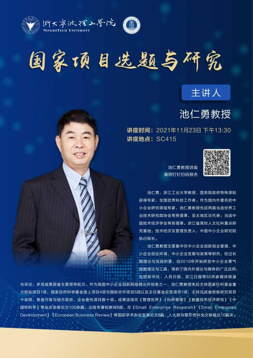 池仁勇教授主要集中在中小企业创新创业管理、中小企业创业环境、中小企业发展与政策等研究,经过长期理论与实践积累,自2010年开始研发中小企业景气指数理论与工具,得到了国内外理论与媒体的广泛应用,包括新华社、人民日报、浙江日报等50多家媒体报道与采访,多项成果获省主要领导批示。作为我国中小企业创新网络理论开创者之一,池仁勇教授先后主持国家社科基金重大招标项目1项,国家自然科学基金面上项目4项与国际合作项目5项以及主任基金应急项目1项,主持完成省部级研究项目十余项、各类厅级与地方政府、企业委托项目数十项。成果连续在《管理世界》《科研管理》《数量技术经济研究》《中国软科学》等杂志发表论文100余篇,出版专著和教材8部,在《Small Enterprise Research》《Small Enterprise Development》《European Business Review》等国际学术杂志发表论文8篇,人大报刊复印资料全文转载达10篇次。
