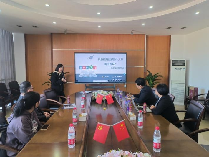 谷雨老师围绕“税收能否效激励个人慈善捐赠?——理论与实验综述”主题,介绍国内外相关研究的前沿理论和研究进展,系统梳理相关成果,并在此基础上分享个人慈善捐赠税收激励政策的效应测算和优化路径。商学院的部分老师和工作坊的研究人员参会,并就财税政策与行为实验研究方法结合的可行性和有效性进行了探讨。