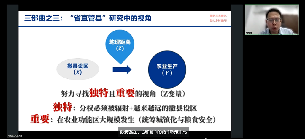 龚斌磊教授以政策评估为例,讨论了实证研究中的视角选择的意义,他分别从“撤县设市”研究中的视角选择、“省直管县”研究中的视角选择、“撤县设区”研究中的视角选择的三部曲来探讨了视角选择的重要性,告诉大家如何去寻找独特且重要的视角。