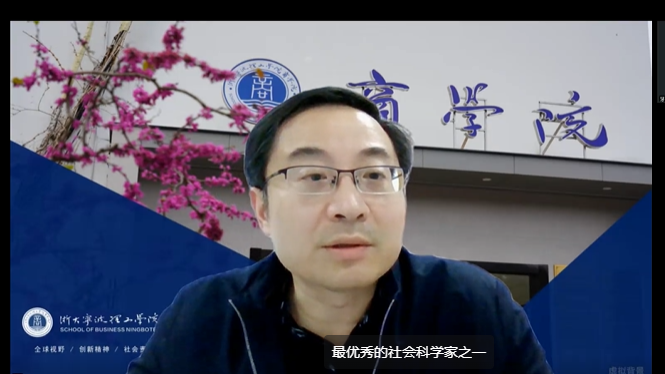 苗青教授致欢迎辞,他介绍了浙大宁波理工学院人文社科学院的概况,同时向与会师生介绍了龚斌磊教授的学术成就及其影响,对龚斌磊教授表示热烈欢迎。