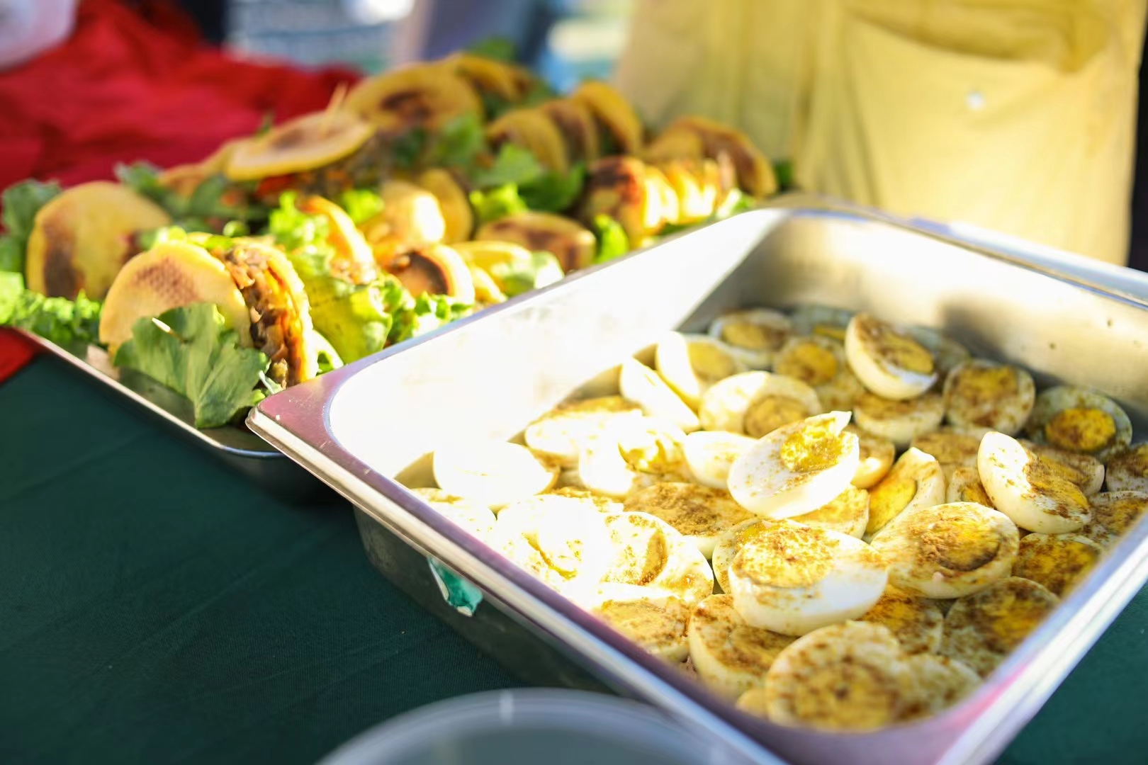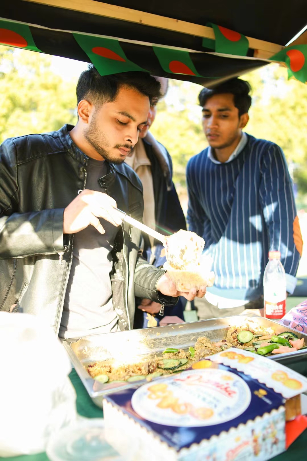 在文化集市区域,国际学生们纷纷穿着家乡的传统服饰,在自己精心布置的展位上展示自己国家的文化和特色。整个现场充满了浓厚的异国风情。来自摩洛哥、阿尔及利亚、印度、孟加拉的师生们亲手烹饪了一道道传统美食,提供给现场师生享用,各个展位前大排长龙,门庭若市,刚出锅的美食短短十几分钟就被一扫而空。