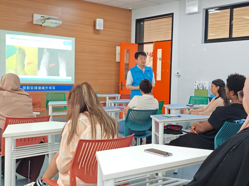 接着,申成春医生(宁波市第六医院)分享了足踝扭伤的处理方法。他表示,足踝扭伤是一种非常常见的运动损伤,尤其在运动和日常生活中容易发生。生动介绍了如何处理不同程度的足踝扭伤,并现场展示了使用绷带和固定装置的方法。还告知国际生们在运动和日常生活中要注意保护自己的足踝,避免发生意外。